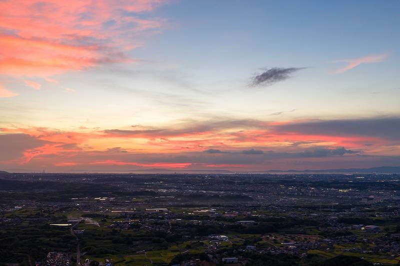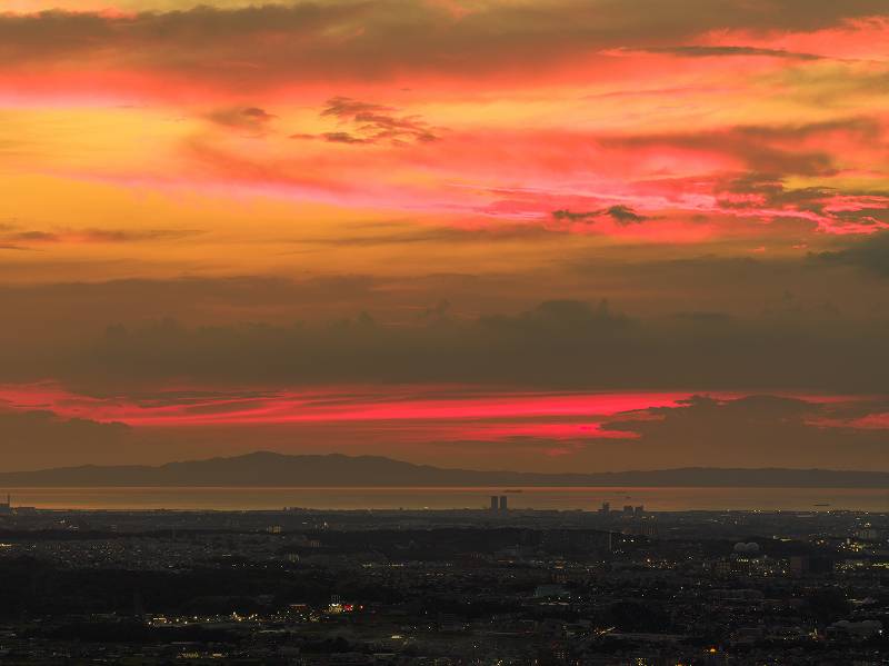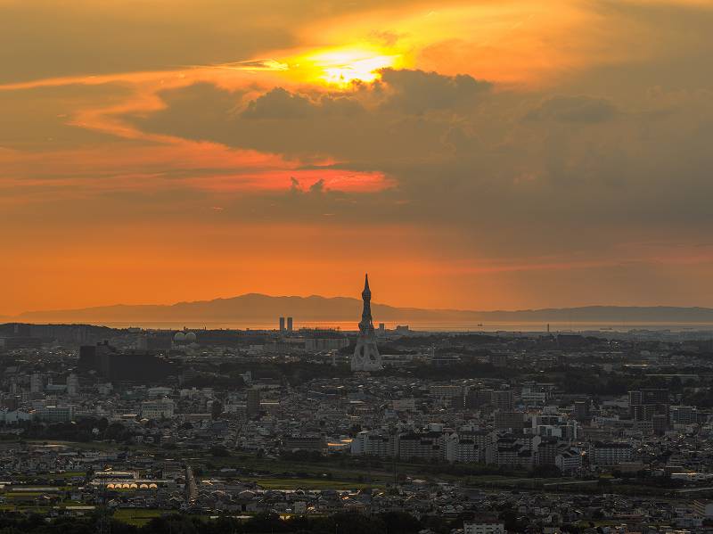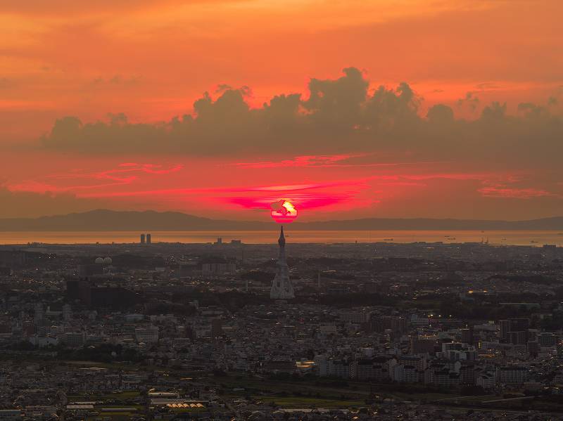 大阪府南河内郡河南町にある持尾展望台から南北に移動してPLの塔と夕陽を撮影しました。