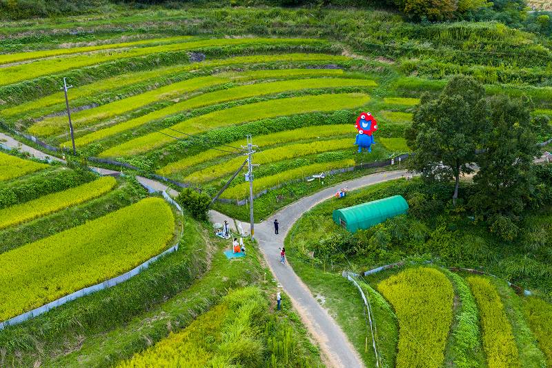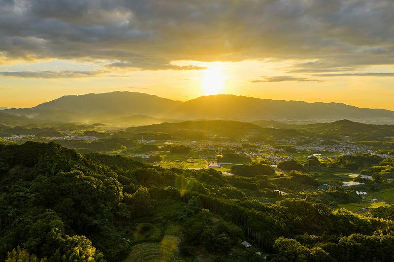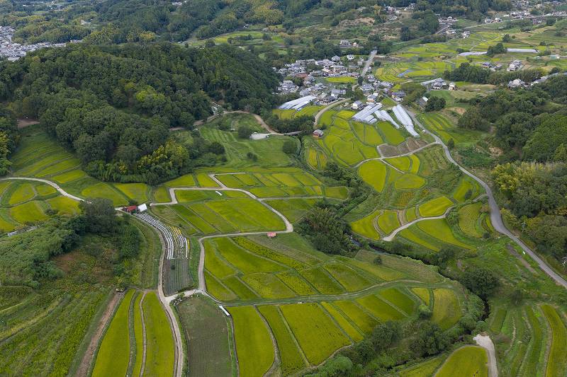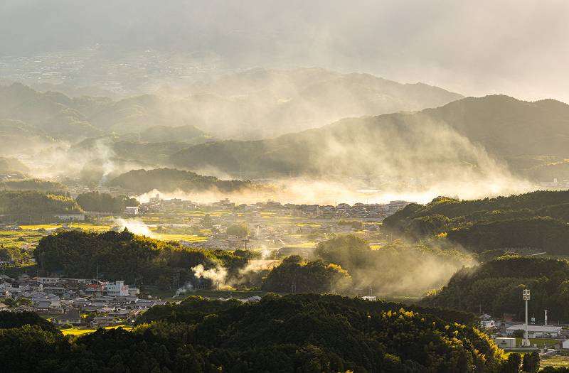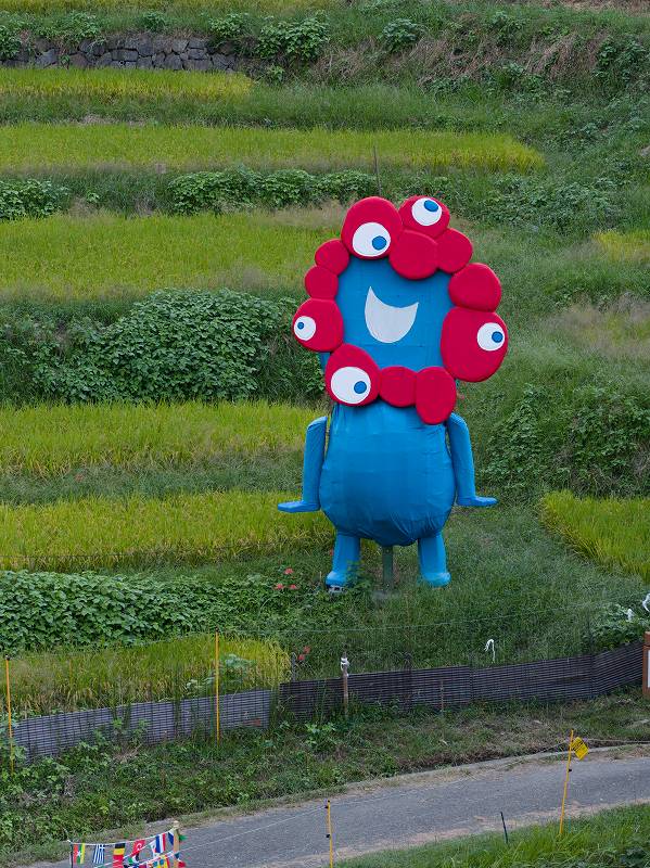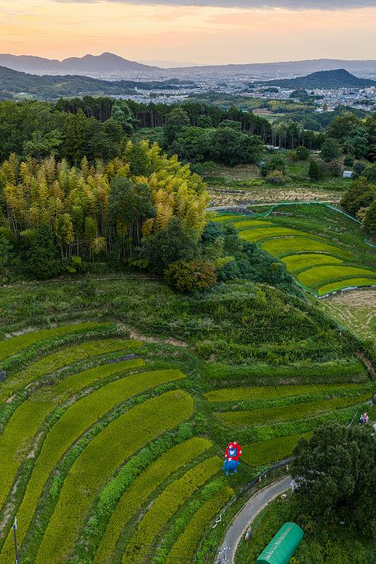 奈良県明日香村の稲渕の棚田を夕暮れ時に撮影しました。 案山子ロードのミャクミャクの大型案山子(かかし)を中心に棚田全景と145m上空から見る飛鳥の煙たなびく風景がとてもきれいでした。