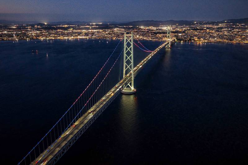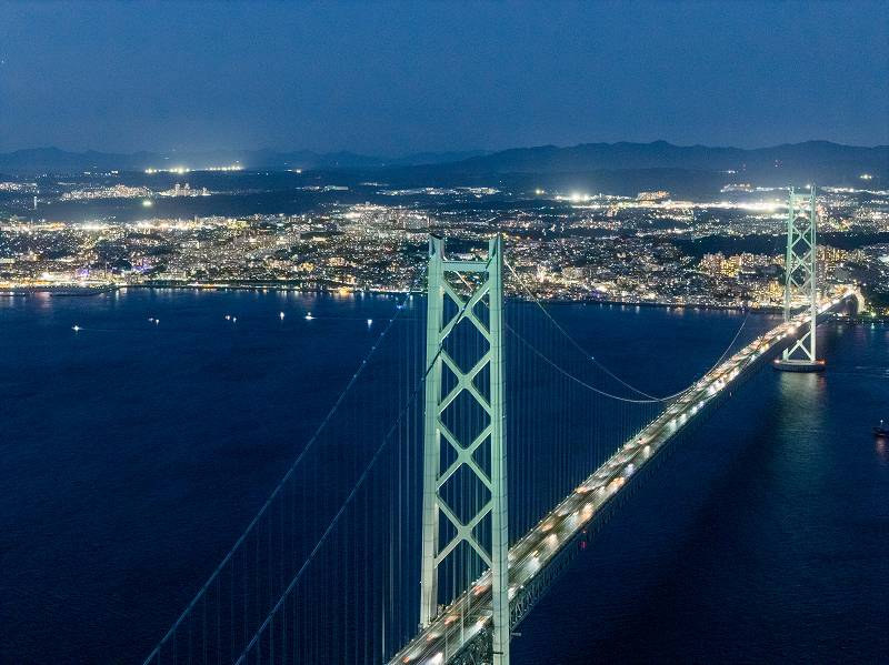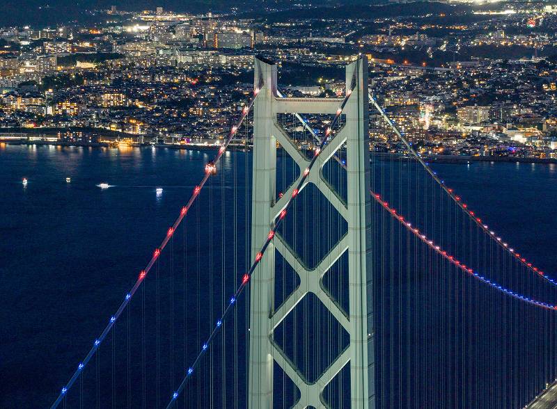 最高高度350m:明石海峡夜景:明石海峡大橋とフェリーとサービスエリアの観覧車