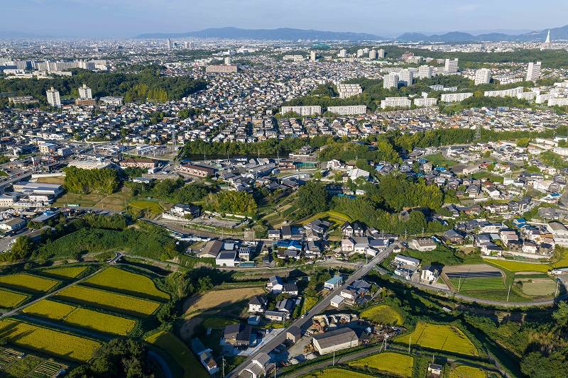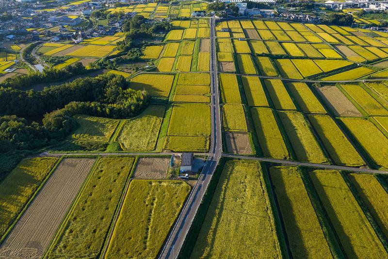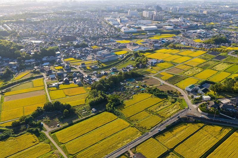 大阪府堺市南区で秋の田園風景を空撮 黄金色に実った稲穂が美しい 太陽が傾いた午後4時に撮影